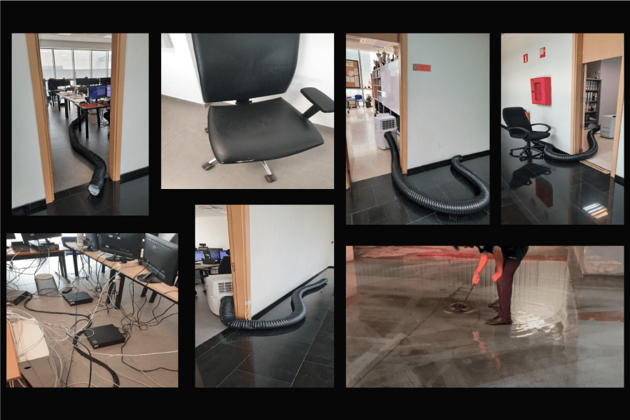 Para intentar paliar esta situación la Jefatura ha colocado aires acondicionados portátiles tipo “pingüino” que, de todas luces, a lo que hay que sumar que el conducto de expulsión del aire caliente se coloca dentro del doble techo, sin salida al exterior. Con lo cual ese aire no es expulsado fuera de la sala y produce condensación en el doble techo por donde además discurren cableado eléctrico circunstancia que se está dando en la Unidad de Mantenimiento de vehículos sita en la planta menos uno de dicho edificio.